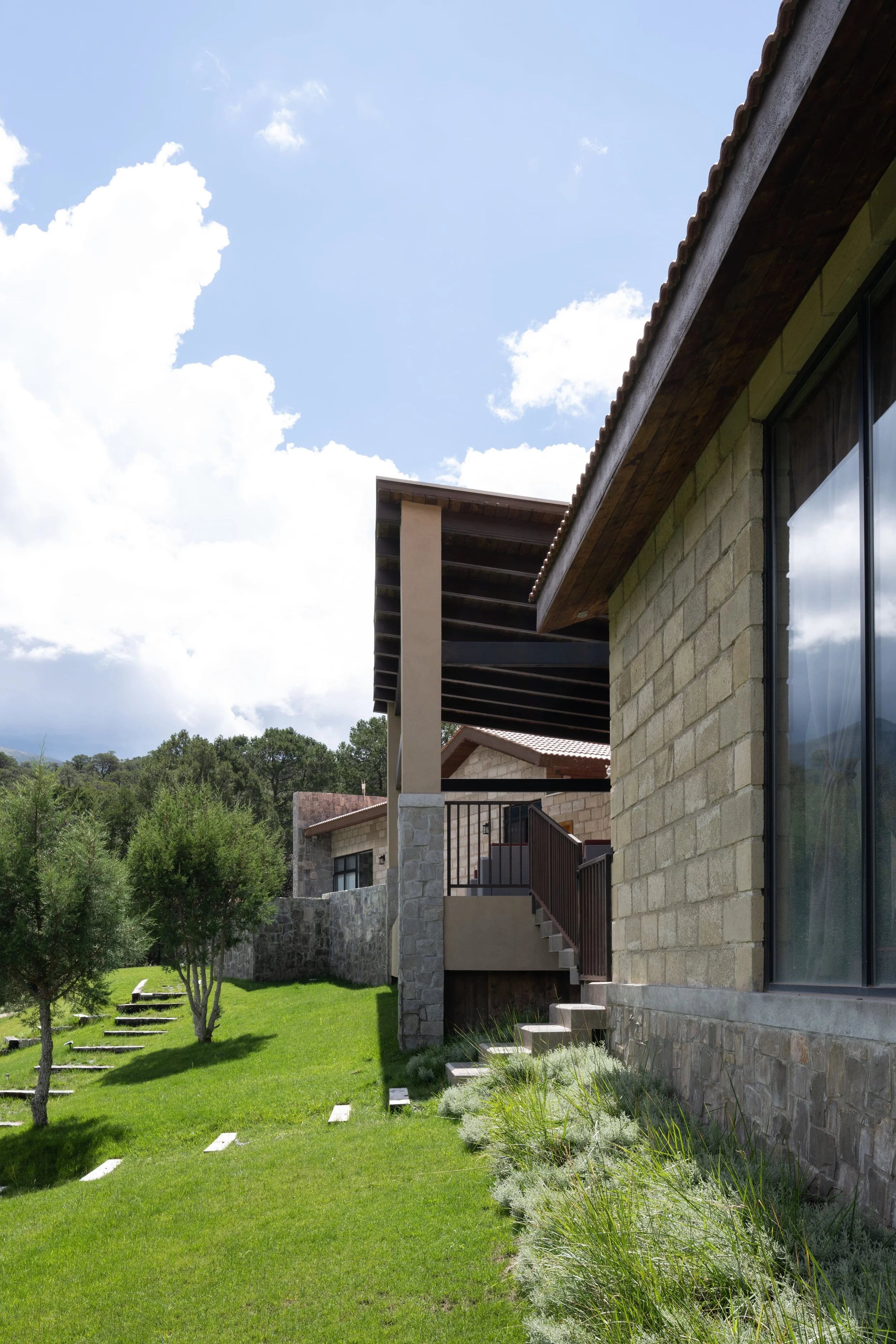 El proyecto está rodeado por un bosque de pinos donde pasa una cañada. Conectamos el proyecto a su entorno y al mismo tiempo, lo elevamos del sitio para permitir el paso natural del agua, de flora y fauna. No fue necesario mover ni un solo pino, ya que nos adaptamos a los elementos preexistentes.