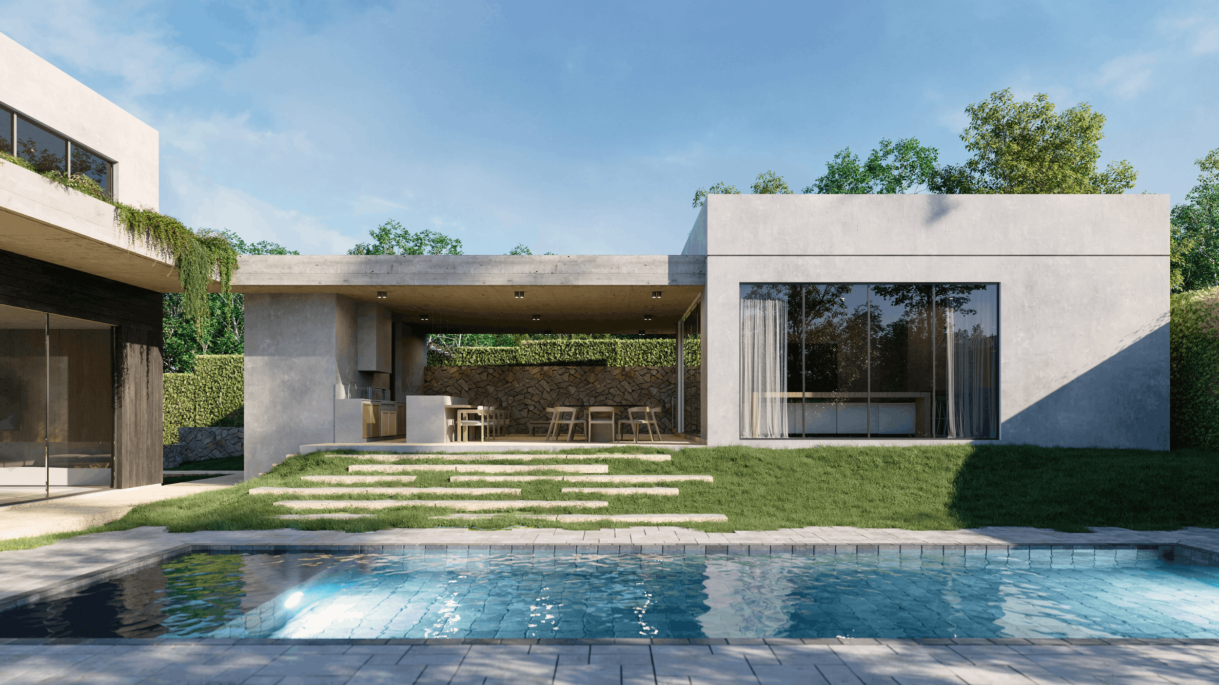 El proyecto se plantea por etapas, permitiendo habitarlo de manera progresiva. En una primera fase, el área social exterior —palapa, cuarto de juegos/bar, alberca y rooftop— funciona como punto de encuentro y convivencia. La segunda etapa integra el programa principal de la vivienda: cocina, sala, comedor, recámara principal con terraza privada y dos recámaras secundarias.